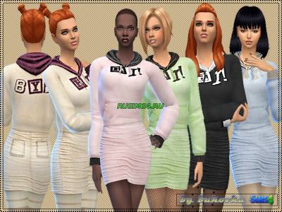 комплект женской одежды, в первый комплект входит байка бежевого цвета с надписью на спине и на груди, имеется капюшон, большой сквозной карман, к байке этой прикреплена юбка, далее у нас идут калготки, цветом они бежево-коричневые, и на ногах у нас присутствуют валенки, так-же есть и другие комплекты