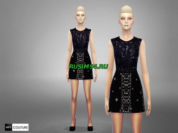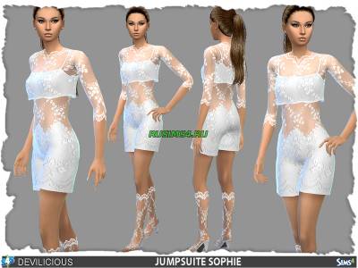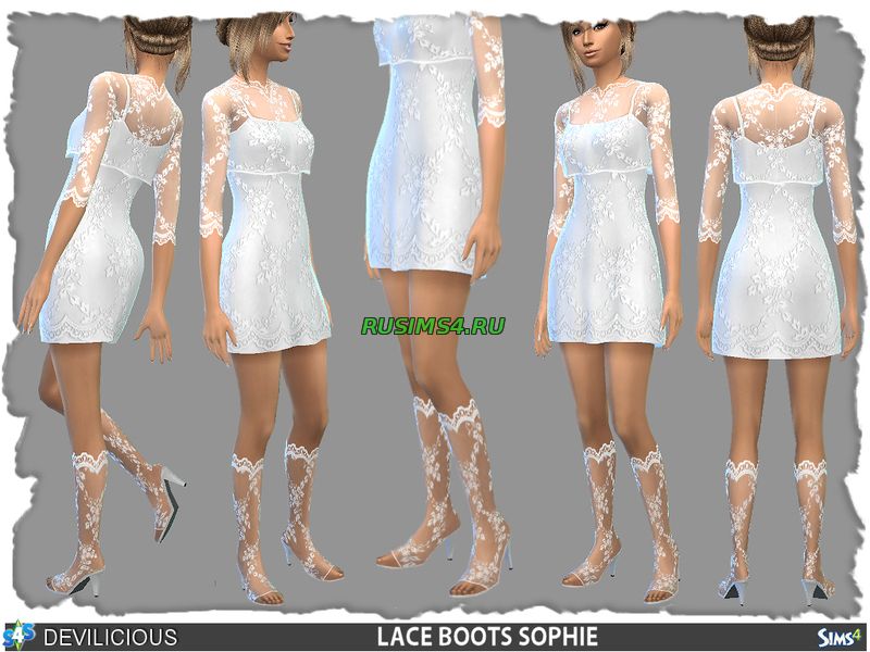женское необычное платье, белого цвета, по длине короткое, так-же в месте с платьем идут полу-прозрачные туфли, на туфлях белыми нитками изображены различные узоры, ещё есть классические туфли, имеется два варианта формата платья, на платье так-же имеются узоры