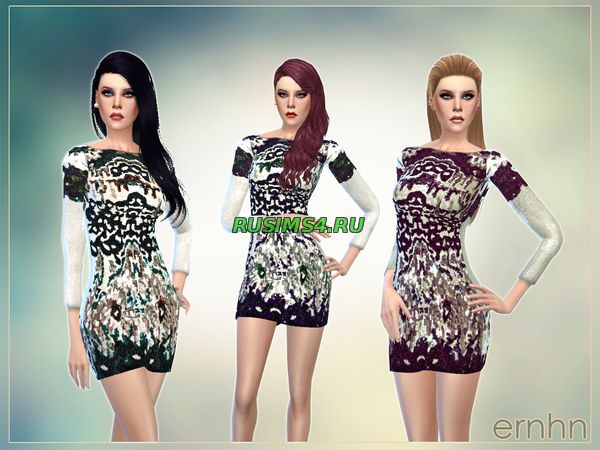облигающее женское платье, на платье изображены различные узоры, основной цвет платья белый, рисунок чёрного цвета, платье короткое, выше колена, рукава платья тоже короткие, горло платья широкое