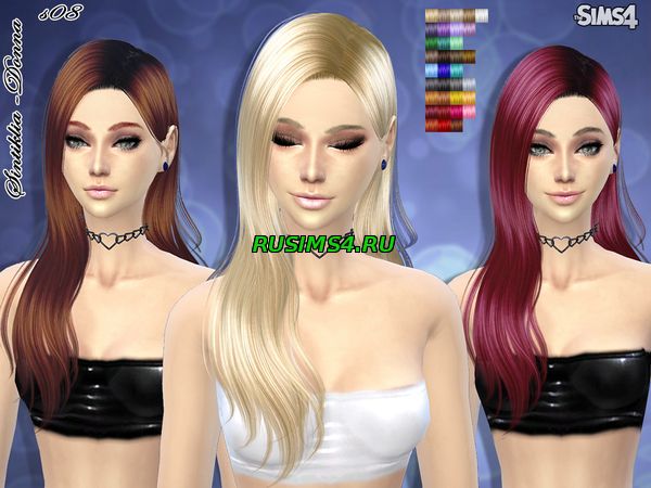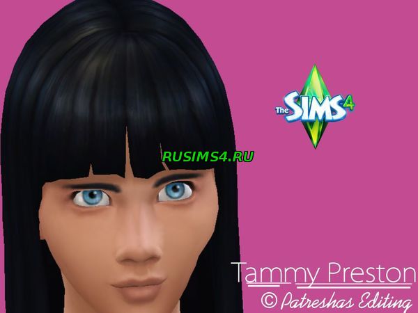 симка от Тамми Престон молодая симка, волосы чёрного цвета, причёска под названием "горшок" красивые голубые глаза, худые щеки, одета в розовую майку в белый горошек, красивая и привлекательная симка.